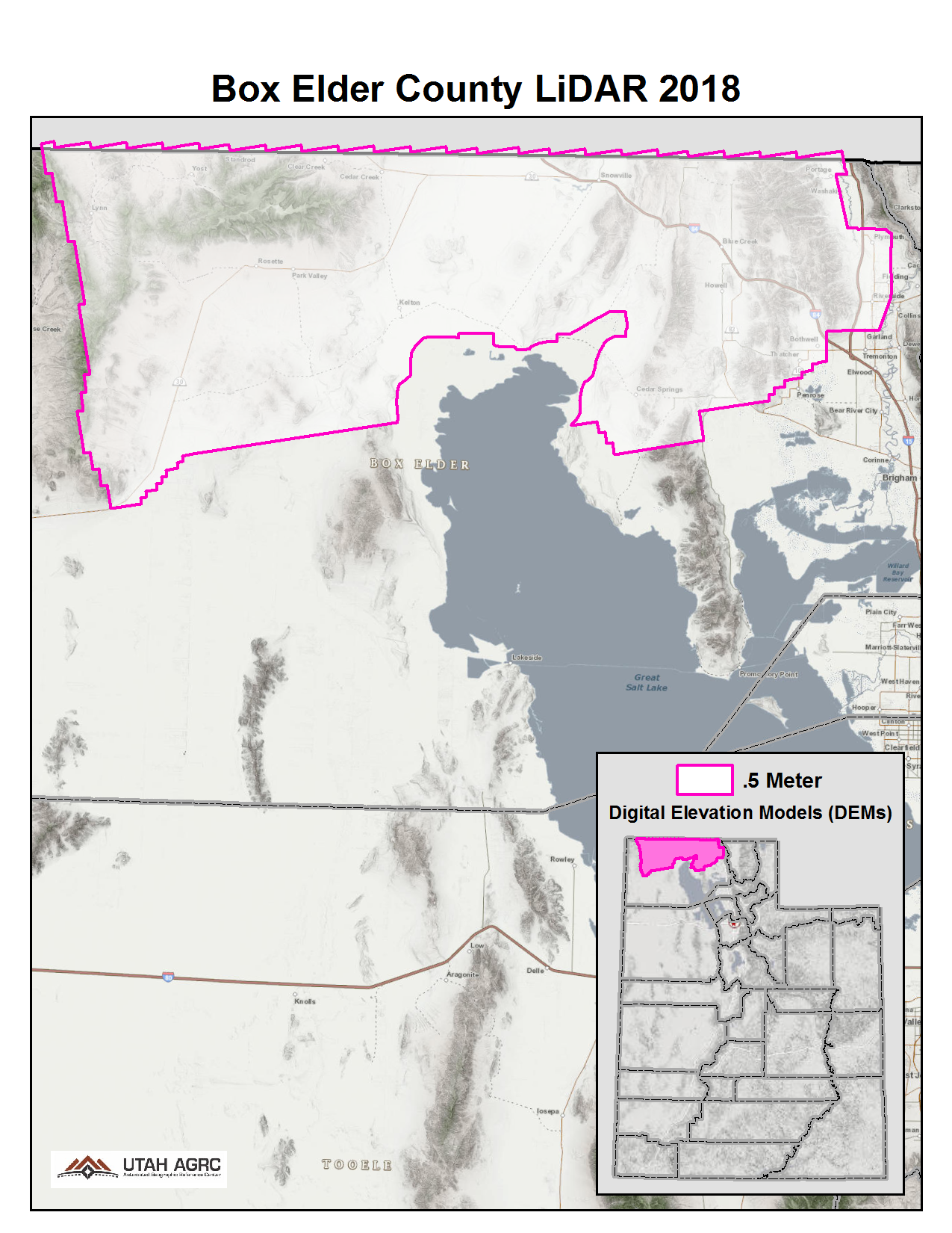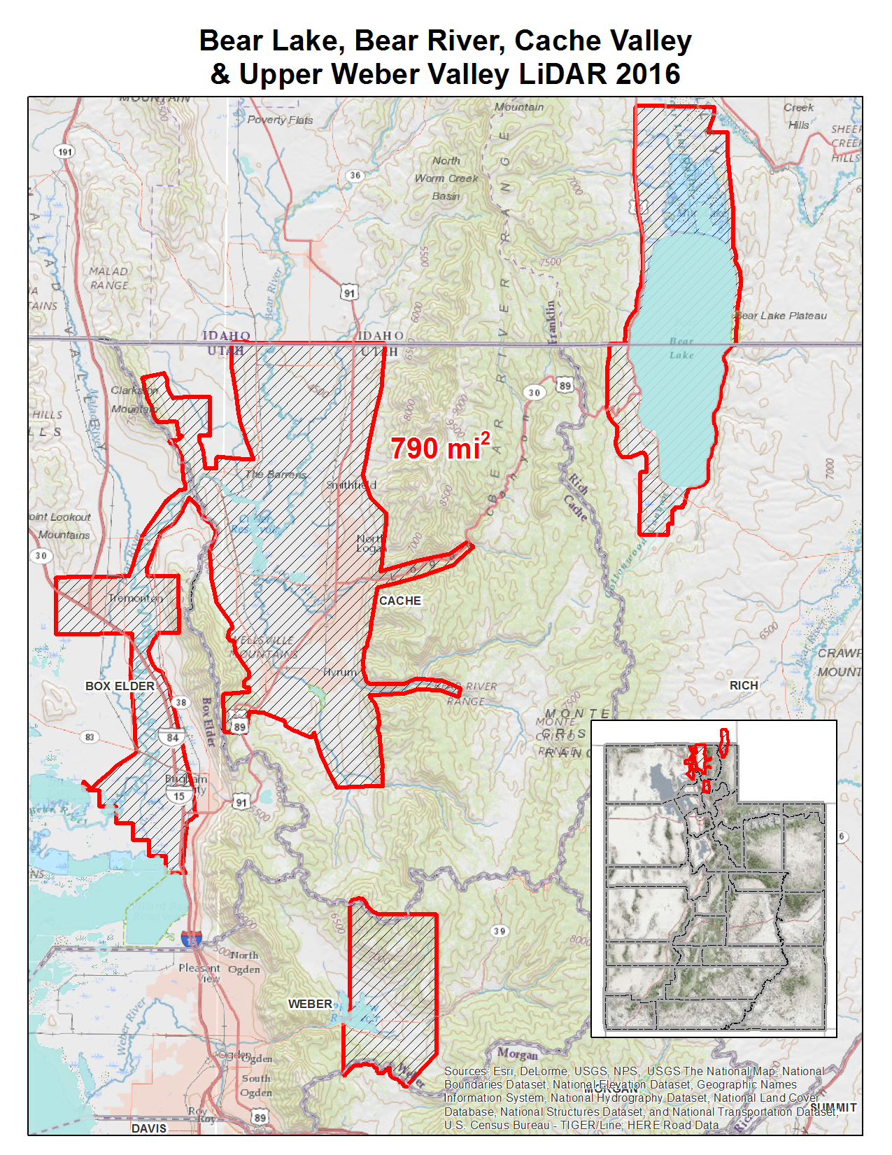 During the Fall of 2016 UGRC, Cache and Weber County, and the Utah Department of Emergency Management acquired ~790 square miles of 8 points per meter Quality Level 1 Lidar. The project areas cover the Cache Valley, Upper Weber Valley, Bear River from Cache County to the Great Salt Lake, and the Bear Lake shoreline. The 0.5 meter resolution bare earth DEMs and first-return/highest-hit DSMs in .img format have a 10.0cm vertical RMSE accuracy and are available for download. The LAS point clouds are available from The National Map , opens in a new tab . This elevation data was collected between September, 2016 and November, 2017.
