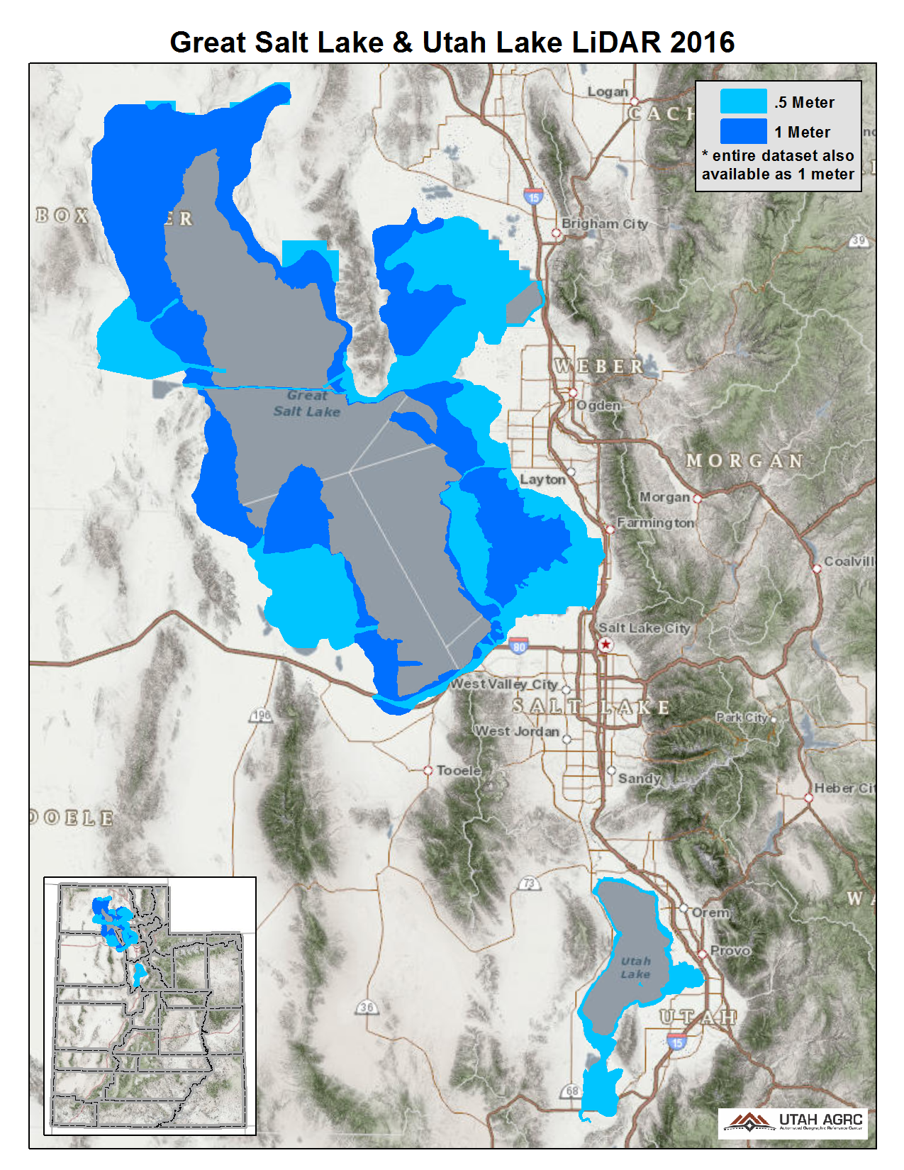 During the Fall of 2016 UGRC, Utah Geological Survey, and the Utah Division of Forestry, Fire and State Lands acquired ~1,555 square miles of 2 and 8 ppm Quality Level 1 and 2 Lidar of the Great Salt Lake and Utah Lake. The GSL portion of the project, collected between September and November 2016, is a combination of 0.5 QL1 and 1 meter QL2. Some areas are available as 0.5 meter although the entire GSL project areas is available as 1 meter. During the acquisition the GSL was at a historical low. The Utah Lake portion, collected between October and November 2016, is all 0.5 meter and is mainly the lake shoreline. The 0.5 and 1 meter resolution bare earth DEMs and first-return/highest-hit DSMs in .img format have a 10.0cm vertical RMSE accuracy and are available for download. The LAS point clouds are available from The National Map , opens in a new tab .
