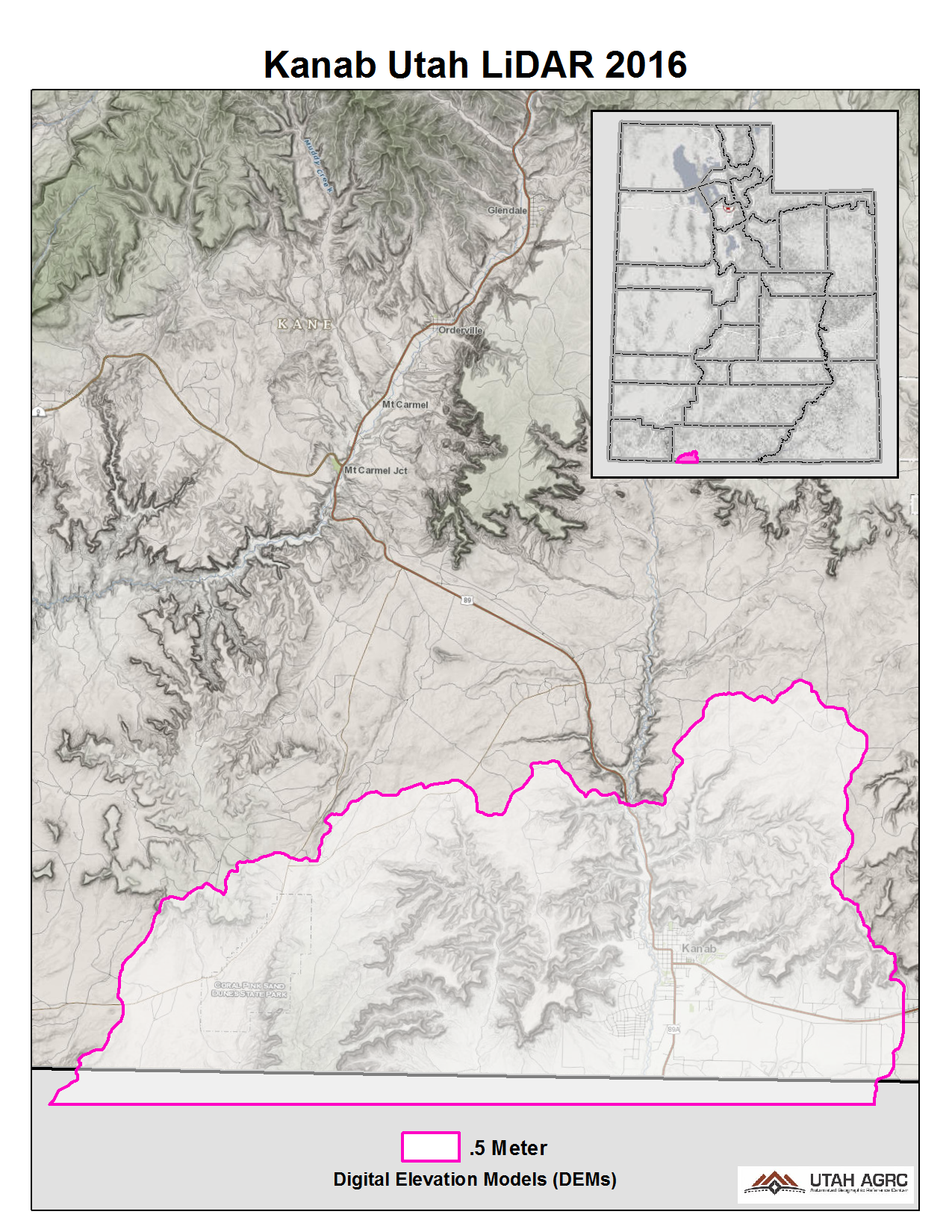 In 2016 the Natural Resource Conservation Service (NRCS) acquired Lidar around Fredonia, AZ that covers ~150 square miles of Utah with 8 points per meter Quality Level 1 Lidar and includes Kanab, UT. The 0.5 meter resolution bare earth DEMs and first-return/highest-hit DSMs in .img format have a 10.0cm vertical RMSE accuracy and are available for download. The LAS point clouds, classified to ground, low, medium, are available from The National Map , opens in a new tab . This elevation data was collected between October and December, 2016.