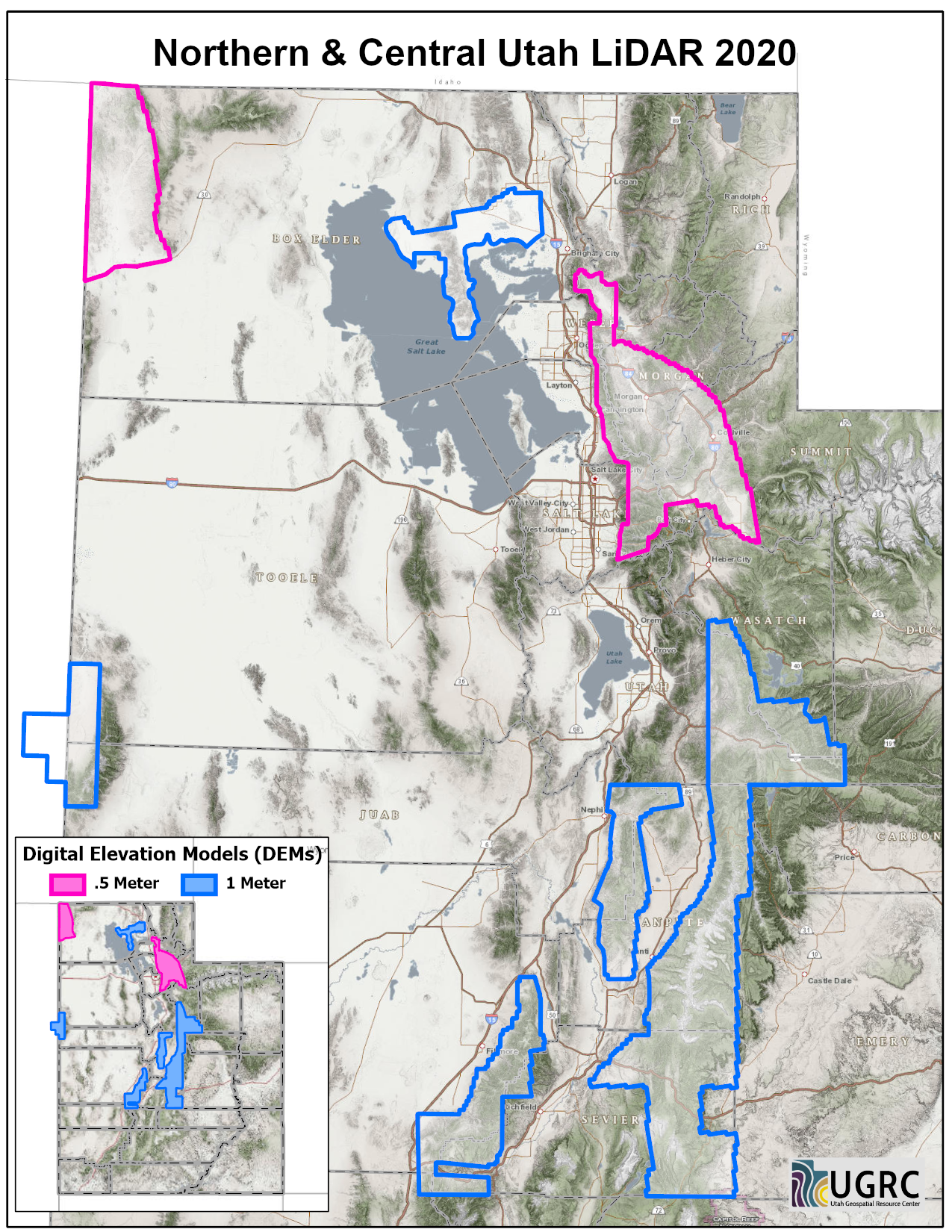 During 2020 UGRC, the Natural Resource Conservation Service (NRCS), and the Utah Division of Emergency Management acquired ~5,262 square miles of 2 and 8 points per meter Quality Level 1 & 2 Lidar for portions of Northern and Central Utah. The 0.5 and 1 meter resolution bare earth DEMs and first-return/highest-hit DSMs in .tif format have a 10.0cm vertical RMSE accuracy and are available for download. The LAS point clouds are available from The National Map , opens in a new tab . This elevation data was collected between April and July, 2020.