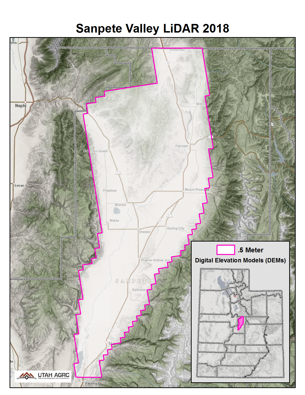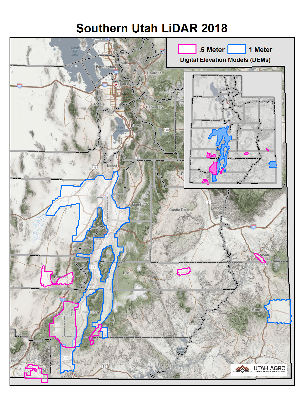 During 2018 UGRC, the Natural Resource Conservation Service (NRCS), and the Utah Geological Survey (UGS) acquired ~440 square miles of 8 points per meter Quality Level 1 Lidar in Central Utah. The 0.5 meter resolution bare earth DEMs and first-return/highest-hit DSMs in .img format have a 10.0cm vertical RMSE accuracy and are available for download. The LAS point clouds are available from The National Map , opens in a new tab .