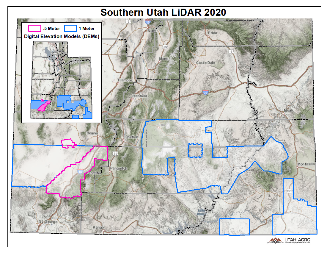 During 2020 UGRC and the Utah Division of Emergency Management acquired ~9,740 square miles of 2 and 8 points per meter Quality Level 1 & 2 Lidar for portions of Southern Utah. The 0.5 and 1 meter resolution bare earth DEMs and first-return/highest-hit DSMs in .tif format have a 10.0cm vertical RMSE accuracy and are available for download. The LAS point clouds are available from The National Map , opens in a new tab . This elevation data was collected between May and July, 2020.